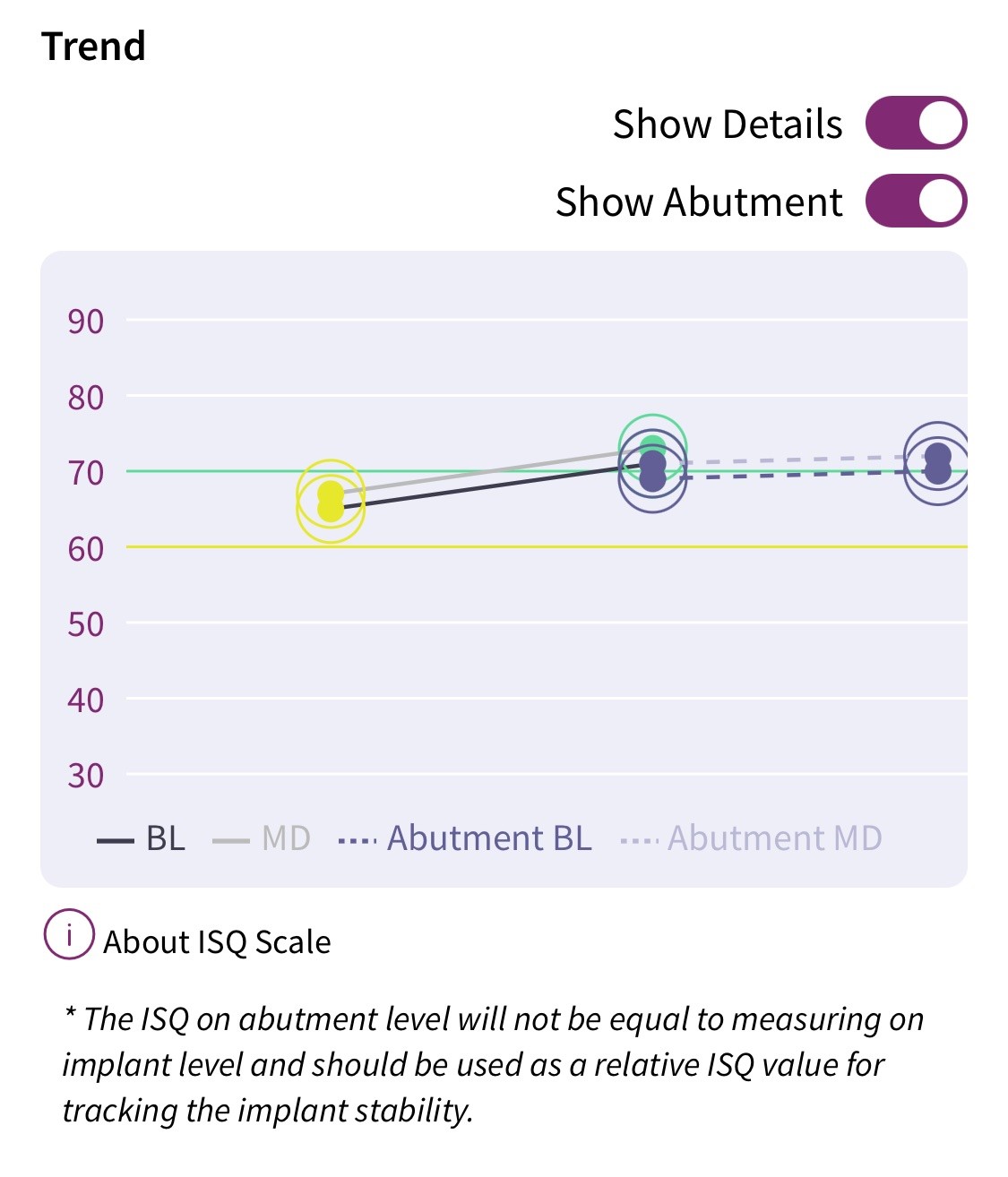 We recommend taking an Osstell ISQ reading at the implant level and then compare it with the Osstell ISQ value taken at the abutment level, to calibrate the Osstell ISQ at the abutment level. The Osstell ISQ taken at the abutment level can then be used as a relative Osstell ISQ value for tracking the implant stability during the healing period.