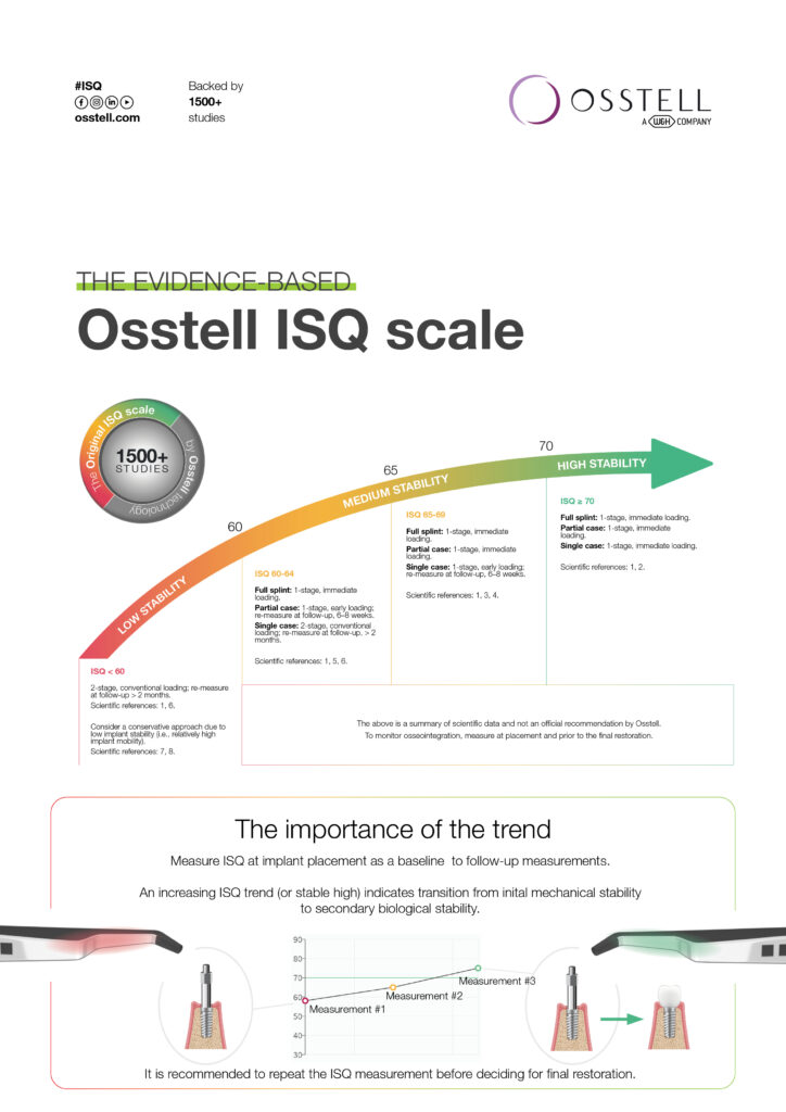ISQ, or Implant Stability Quotient, is a scale from 1 to 99 and is a measure of the stability of an implant. The ISQ scale has a non-linear correlation to micro mobility. With more than 1500 scientific references, we now know that high stability means >70 ISQ, between 60-69 is medium stability and < 60 ISQ is considered as low stability.