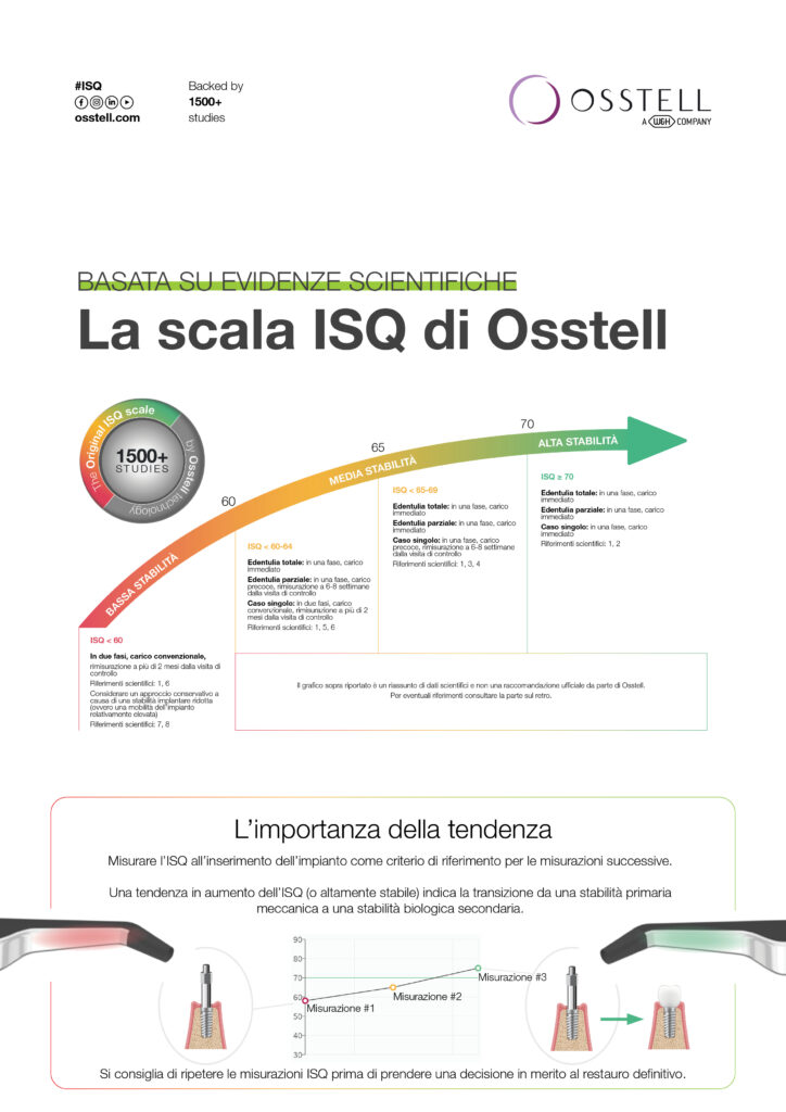 ISQ, o indice di stabilità implantare, è una scala da 1 a 99 ed è una misura della stabilità dell’impianto. La scala ISQ non ha una correlazione lineare con la micro mobilità. Con più 1500 studi scientifici, adesso sappiamo che una buona stabilità deve avere un indice ISQ di almeno 70, un valore tra il 60 e il 69 indica una stabilità media e sotto i 60 una stabilità bassa.