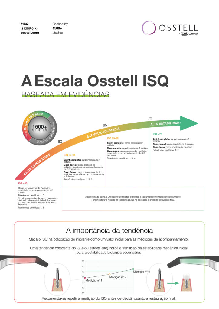 ISQ, ou Quociente de Estabilidade do Implante, é uma escala de 1 a 99 e é uma medida da estabilidade de um implante. A escala ISQ tem uma correlação não linear com a micromobilidade. Com mais de 1500 referências científicas, sabemos agora que alta estabilidade significa >70 ISQ, entre 60-69 é a estabilidade média e <60 ISQ é considerada baixa estabilidade.