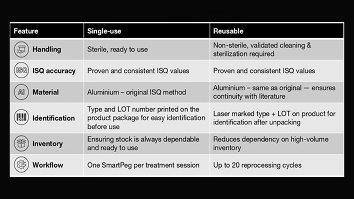 Reusable SmartPegs, introduced in 2026, are designed specifically to withstand multiple cleaning, disinfection and sterilisation cycles without compromising ISQ accuracy.