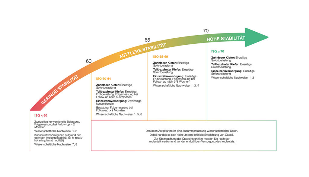 Der ISQ oder Implantatstabilitätsquotient ist auf einer Skala von 1 bis 99 eine Messgröße für die Stabilität eines Implantats. Der ISQ steht in nicht-linearer Korrelation zur Mikromobilität. Auf der Grundlage von mehr als 1500 wissenschaftlichen Quellen wissen wir, dass hohe Stabilität bei einem ISQ-Wert über 70, mittlere Stabilität bei einem Wert von 60-69 und geringe Stabilität bei einem Wert unter 60 liegt.