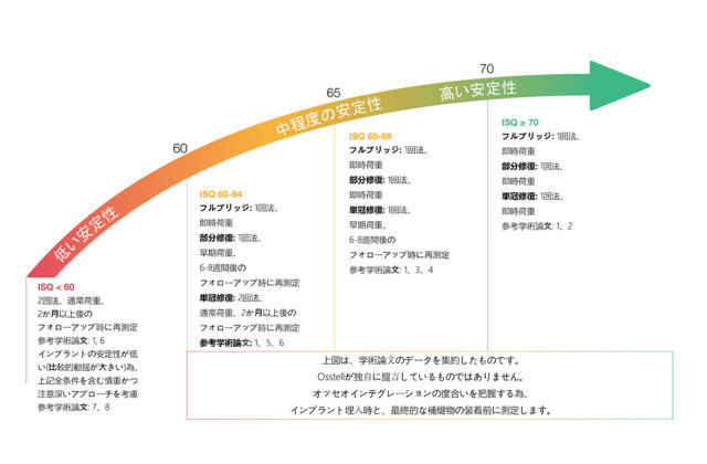 Osstell ISQ スケールが重要です。 Osstellの特許技術は、器具が振動する周波数を測定する、RFA(Resonance Frequency Analysis:共振周波数分析)を使用しています。安定性の違いにより、共振周波数は変化するため、共振周波数を比較することで、歯科インプラントの安定性を判断することができます。