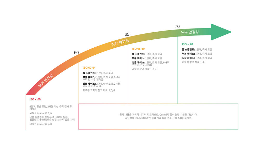 ISQ(임플란트 안정성 지수)는 1에서 99까지의 스케일로 임플란트의 안정성을 측정합니다. ISQ 스케일은 미세 이동성에 대해 비선형 상관 관계가 있습니다. 1,500건 이상의 과학 참고 문헌에 따르면 높은 안정성은 70 ISQ이상, 60~69 사이 값은 중간 안정성, 60 ISQ 이하는 낮은 안정성을 의미한다는 것을 알고 있습니다.