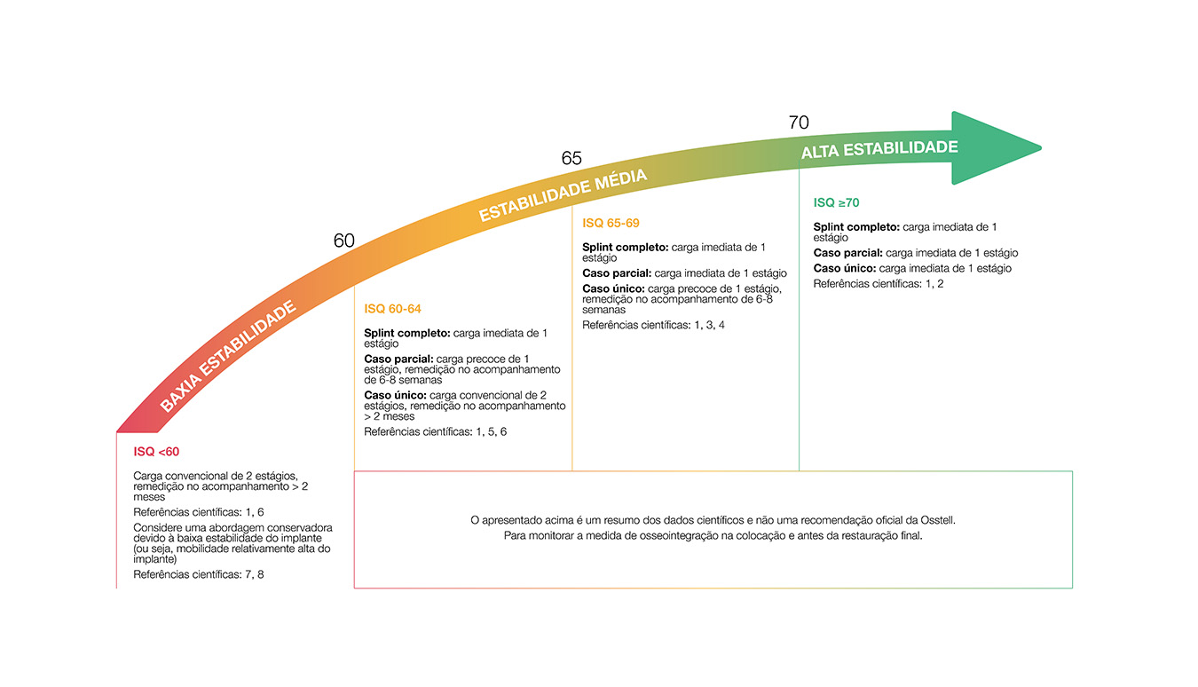 O Quociente de Estabilidade do Implante (ISQ) é um padrão mundial objetivo para medir a estabilidade do implante. O intervalo clínico do ISQ é normalmente 55-80. Valores mais elevados são geralmente observados na mandíbula do que na maxila. A escala ISQ tem uma correlação não linear com a micromobilidade. Com mais de 1500 referências científicas, sabemos agora que alta estabilidade significa >70 ISQ, entre 60-69 é a estabilidade média e <60 ISQ é considerada baixa estabilidade. Se o valor ISQ inicial for alto, uma pequena queda na estabilidade normalmente se estabiliza com o tempo. Uma grande queda na estabilidade ou diminuição deve ser tomada como um sinal de alerta. Espera-se que os valores mais baixos sejam maiores após o período de cicatrização. O oposto pode ser um sinal de um implante malsucedido e ações devem ser consideradas.