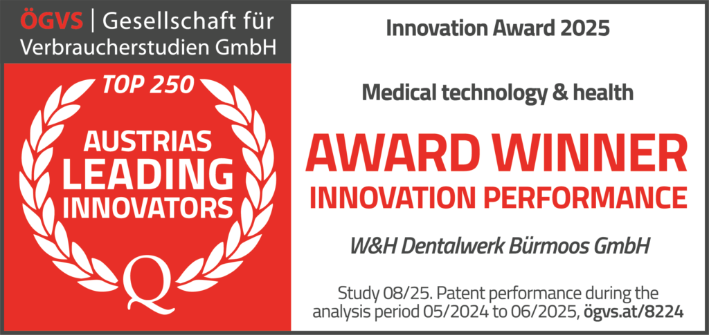 Outstanding research from Austria: W&H has been named one of Austria’s 250 most innovative companies and honoured with the 2025 Innovation Award from the ÖGVS. The recognition is based on the company’s patent performance from May 2024 to June 2025. With 194 patents currently filed and already granted worldwide, W&H continues to drive innovation in medical technology.