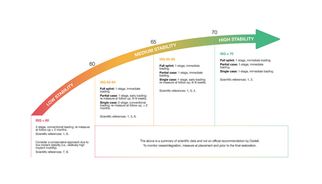 ISQ, or Implant Stability Quotient, is a scale from 1 to 99 and is a measure of the stability of an implant. The ISQ scale has a non-linear correlation to micro mobility. With more than 1500 scientific references, we now know that high stability means >70 ISQ, between 60-69 is medium stability and < 60 ISQ is considered as low stability.
