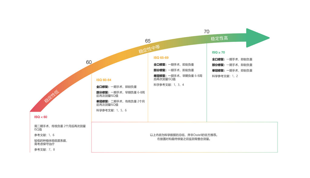 ISQ,或者说种植体稳定系数,分为 1 到 99 的标度,用于量度种植体的稳定性。ISQ 量表与微量移动呈非线性相关。基于超过1500份科学参考文献,我们现在知道高稳定性意味着ISQ > 70,60–69属于中稳定性,ISQ < 60则表示低稳定性。
